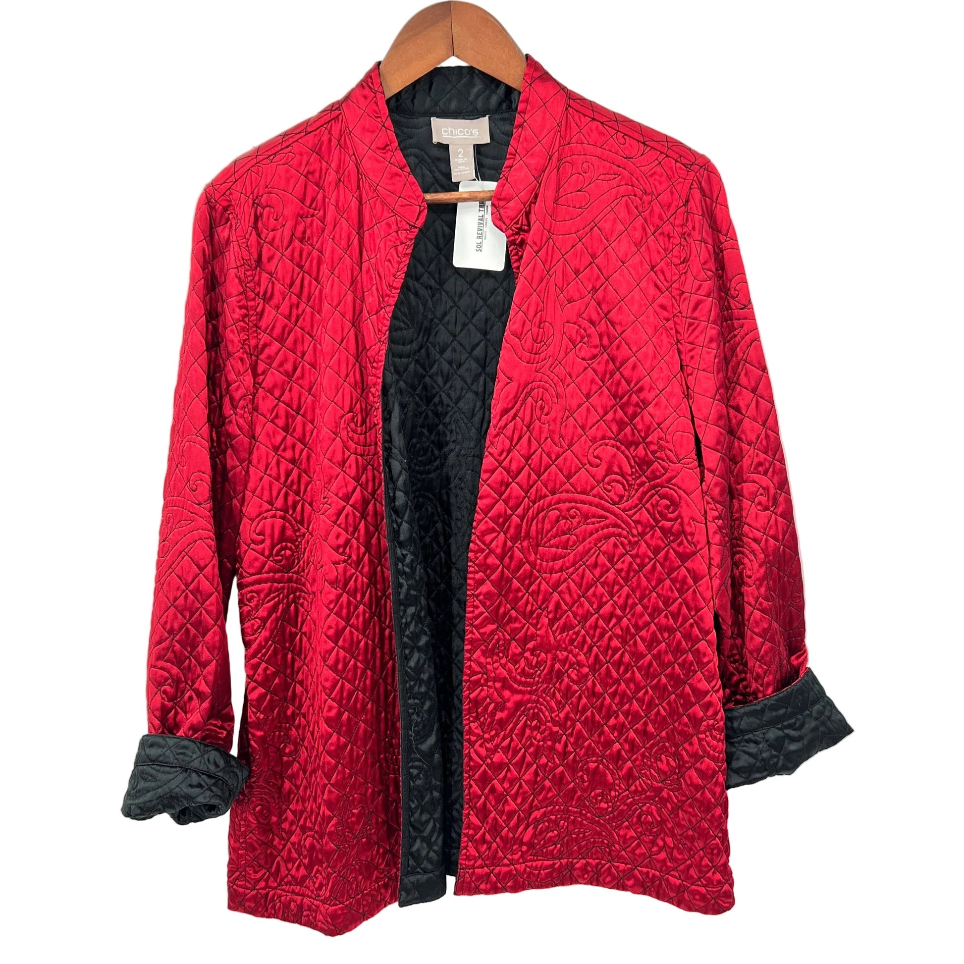 Brand: Chico's | polyester satin like, quilted, no pockets could be reversible if tags are removed, light, fully embroidered. Good pre-owned condition.