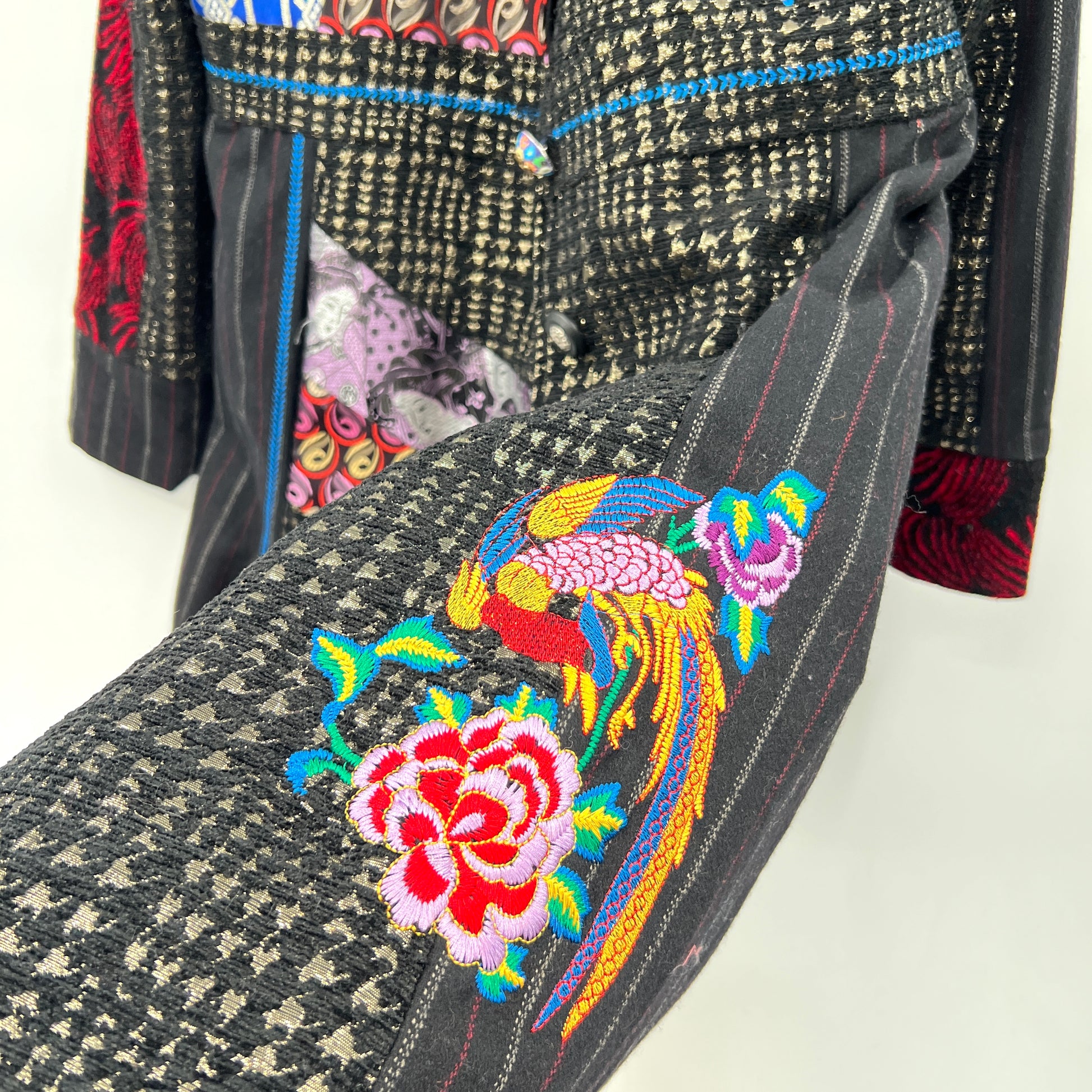 Brand: OZE | Patchwork, embroidered, 50% wool (polyester blend) unique eclectic light insolated coat. Good pre-owned condition, some intentional snags on metalic like fabric see picture. Missmatching buttons.