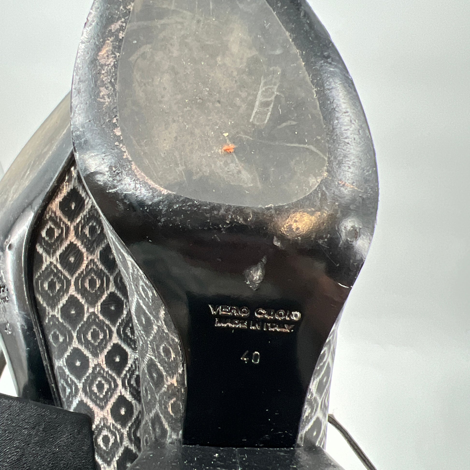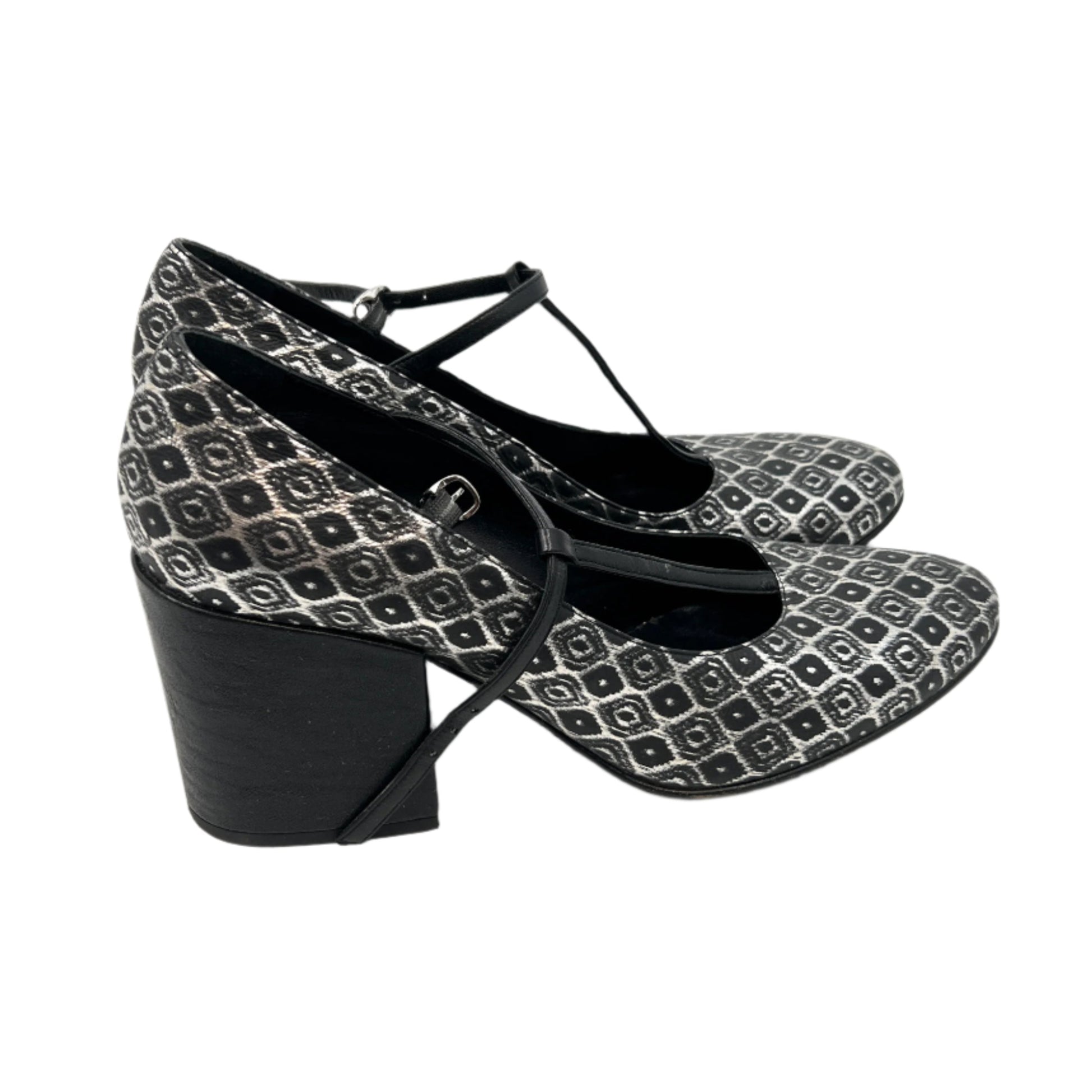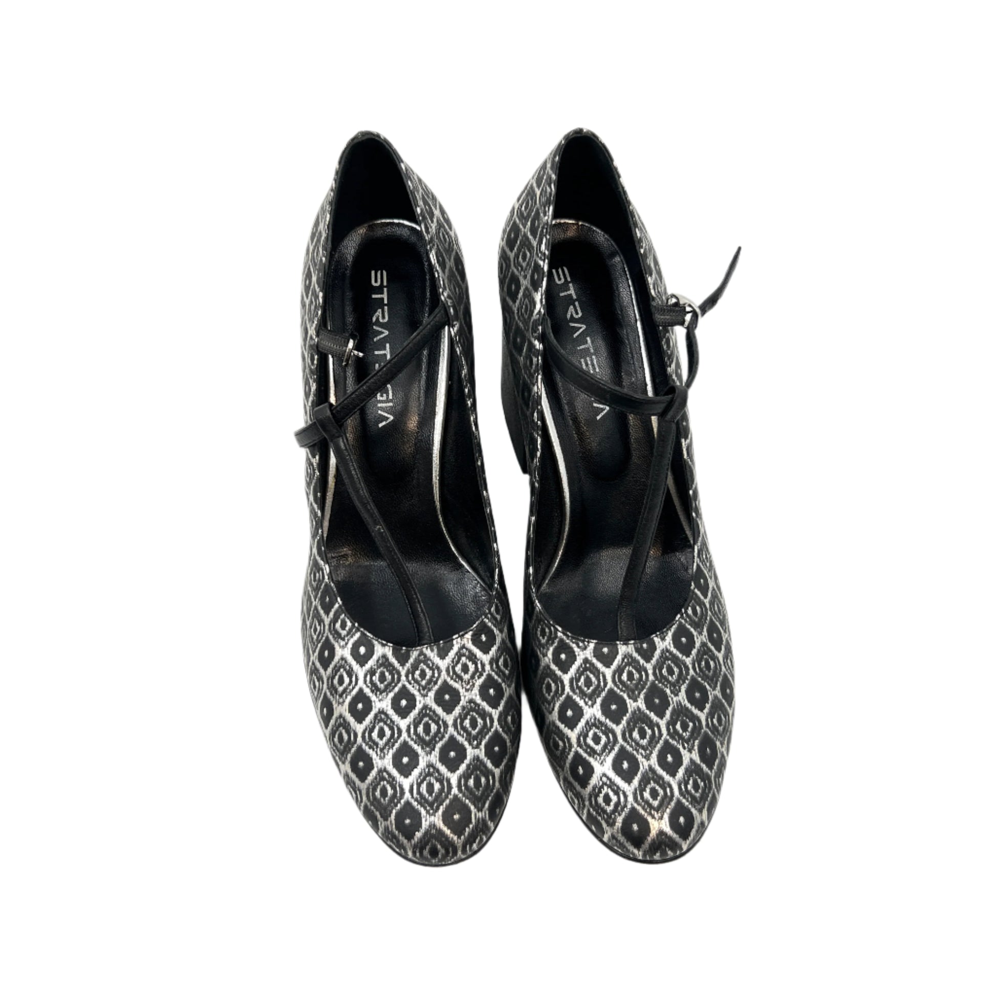 Brand: Strategia | metallic print, leather Upper liner and outsole, t-strap, big beautiful blocky heel, good pre-owned condition.