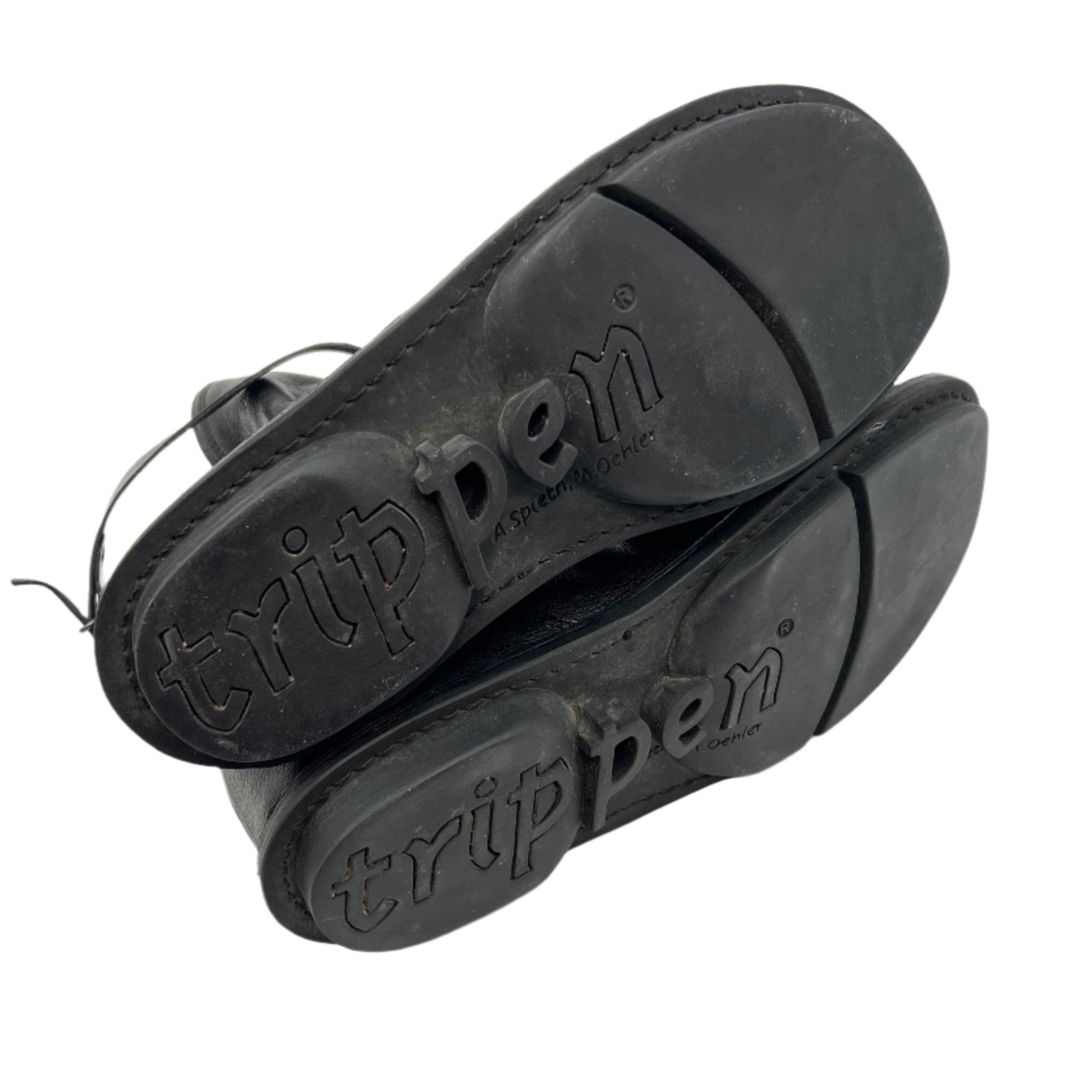 Brand: Trippen | quality leather uppen and liner, good pre-owned condition. Some normal marks of wear on leather insole. Unisex styel. removable leather ankle detail.