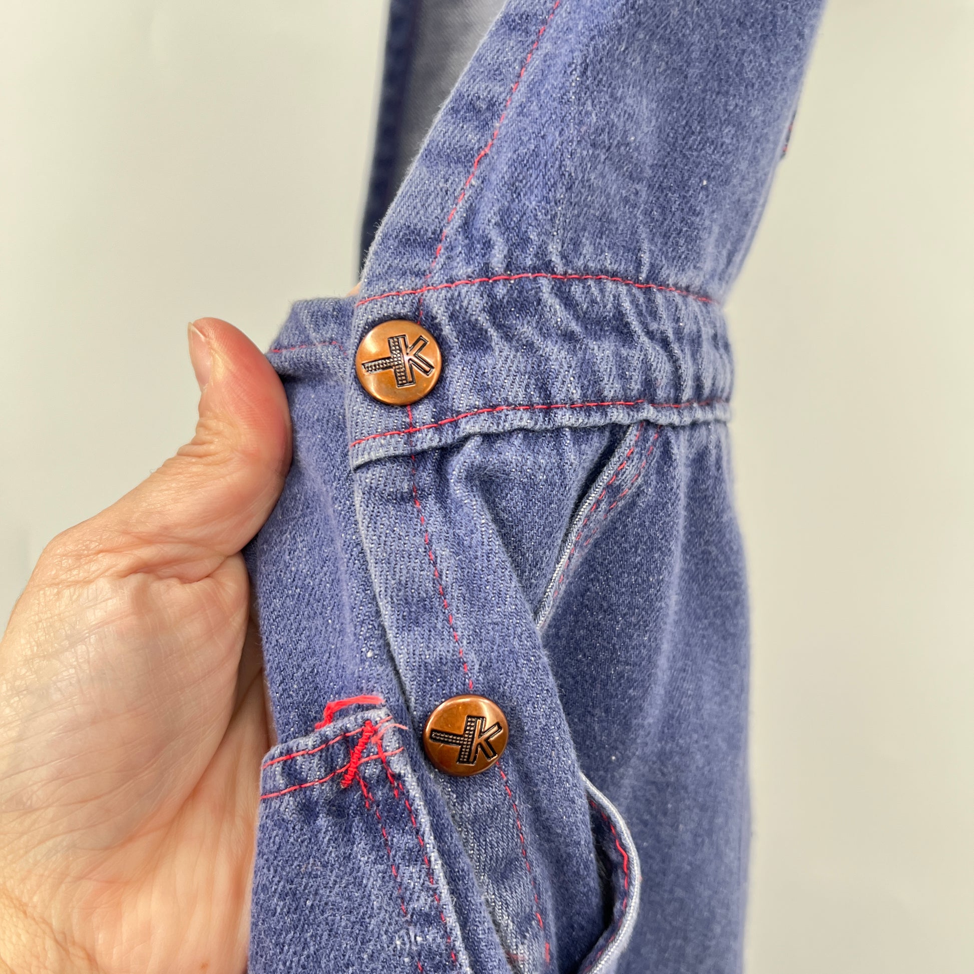 Brand: "TK" (not sure refer to button picture) denim soft, flare style, good pre-owned and vintage condition, stretchy elastic straps.