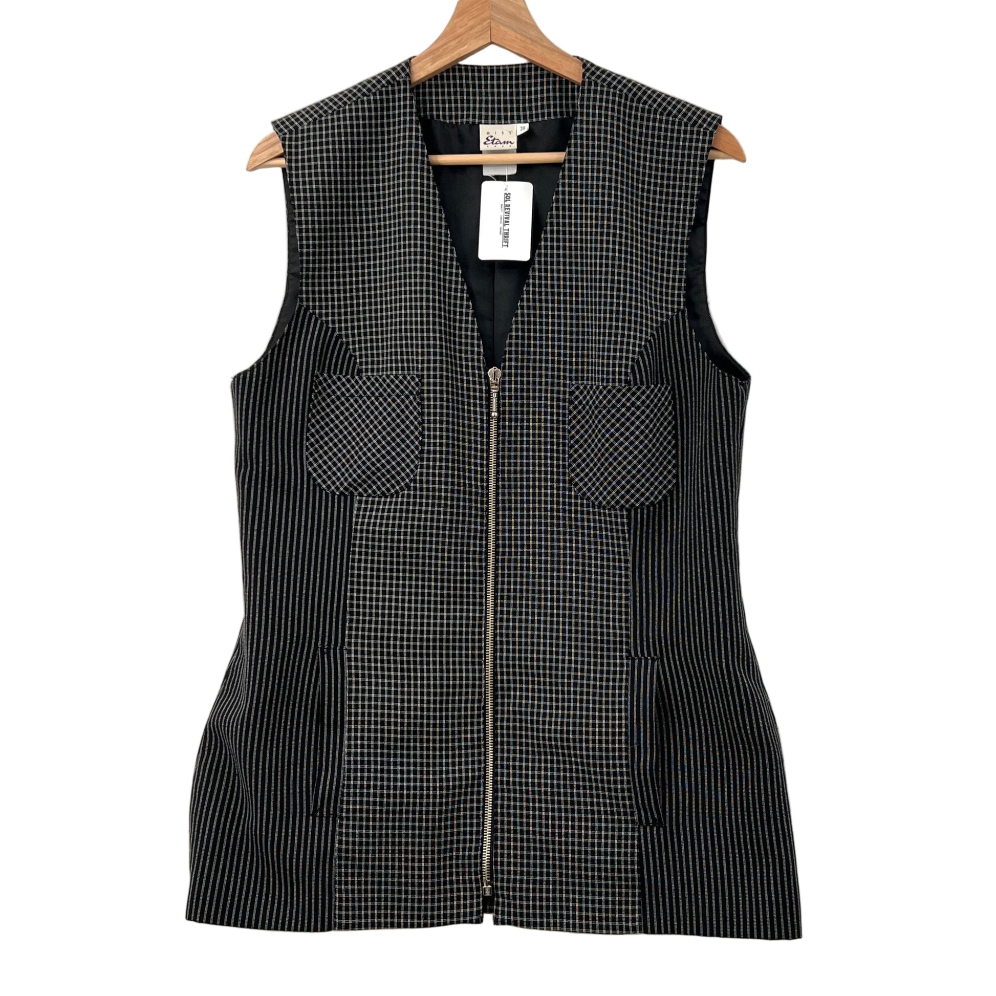 Brand: Miss Etam | Full zip vest, v-neck, lined, ligth, faded fabric tag feels like polyester. good pre-owned and vintage condition.