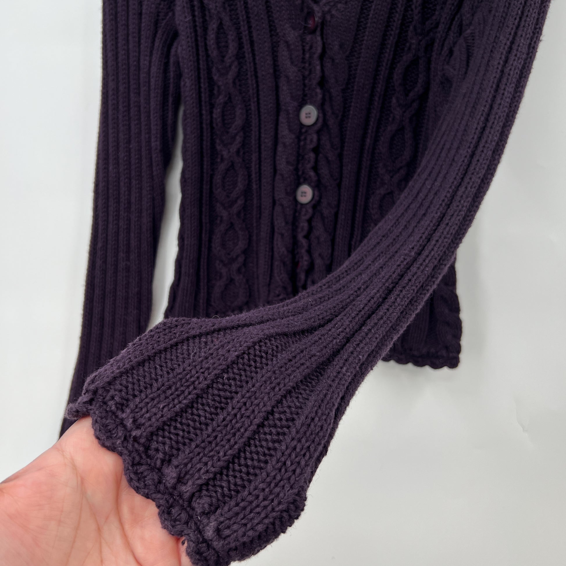 Brand: Moda INTL | cotton ramie blend, rib and cable knit cardigan, v-neck and buttons clousure. Good pre-owned and vintage condition.
