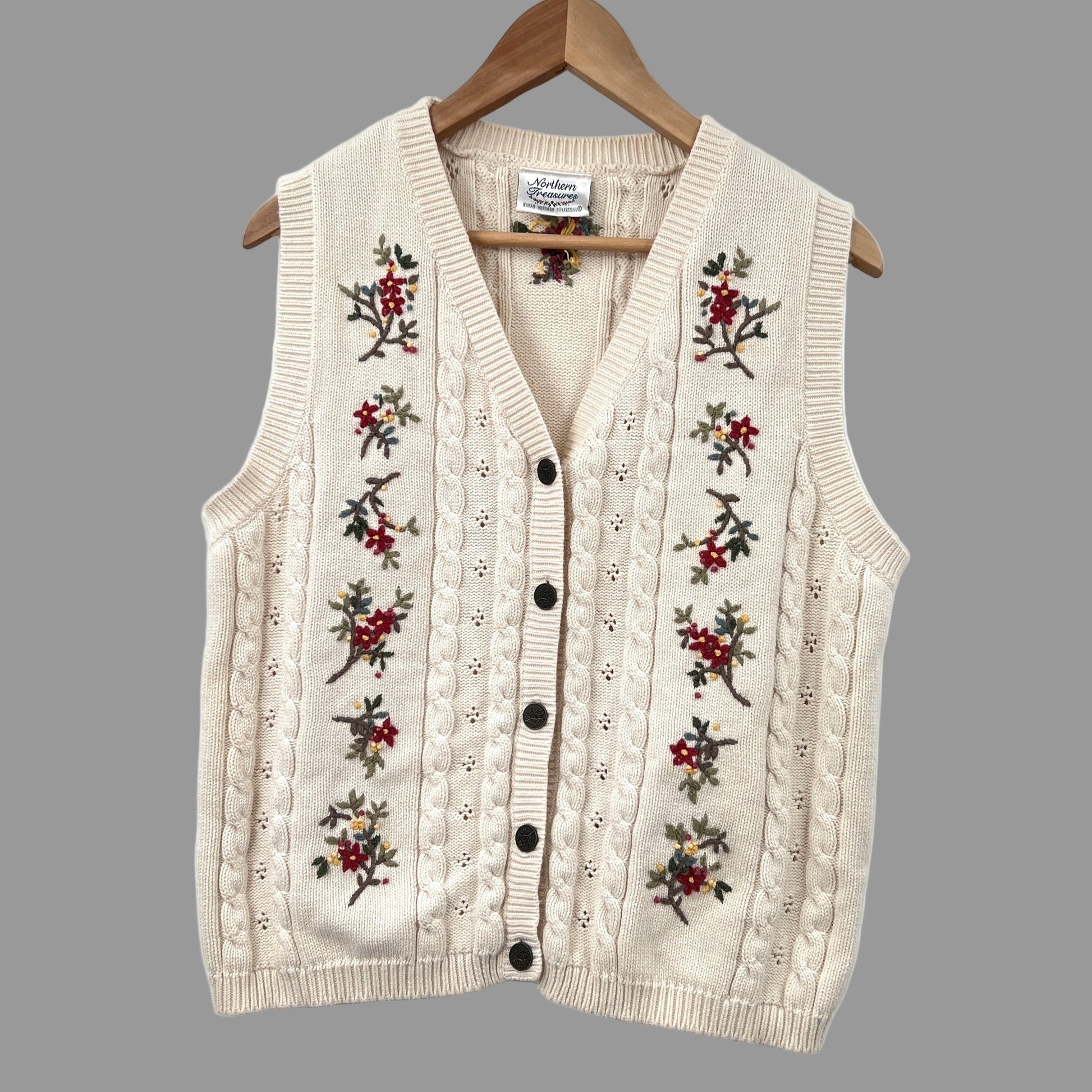 Brand: Northern Treasures | no size tag or yarn, feels like 100% cotton, floral embroidered details, good pre-owned and vintage condition.