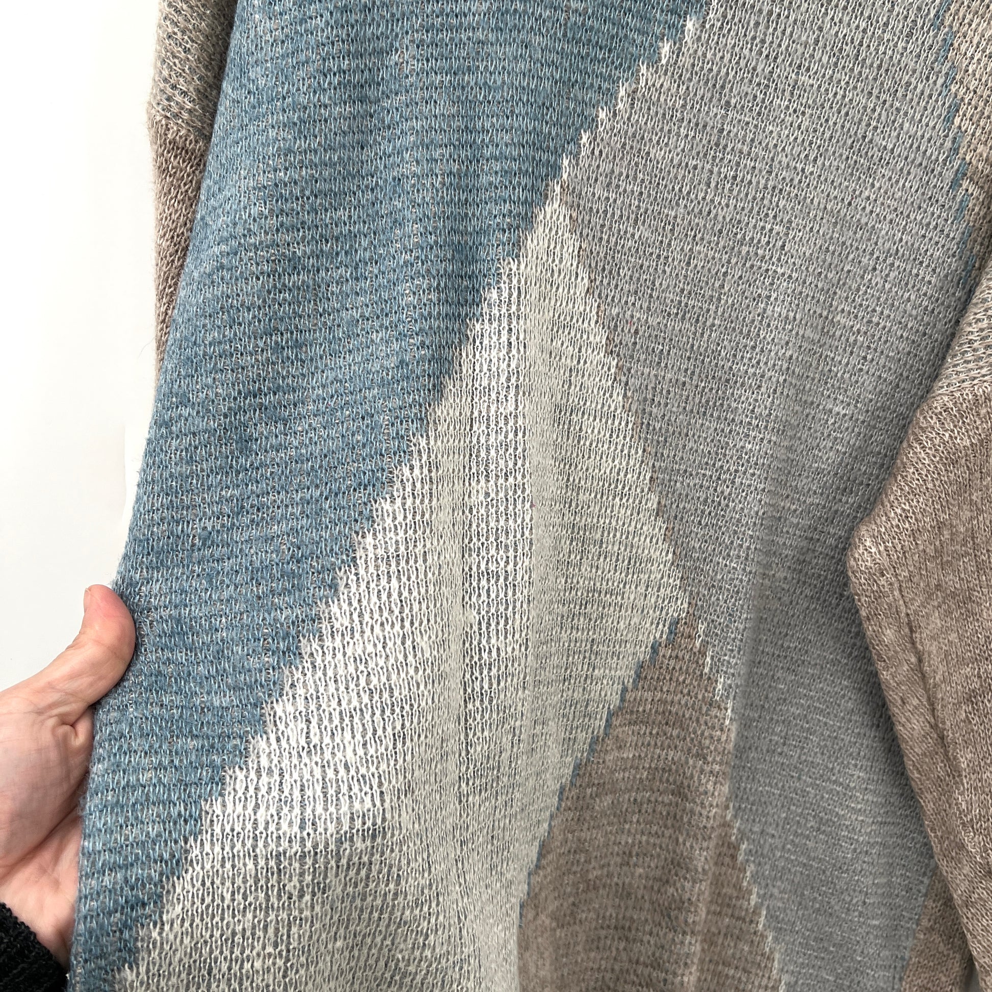 Colour: tanned, grey and light blue.